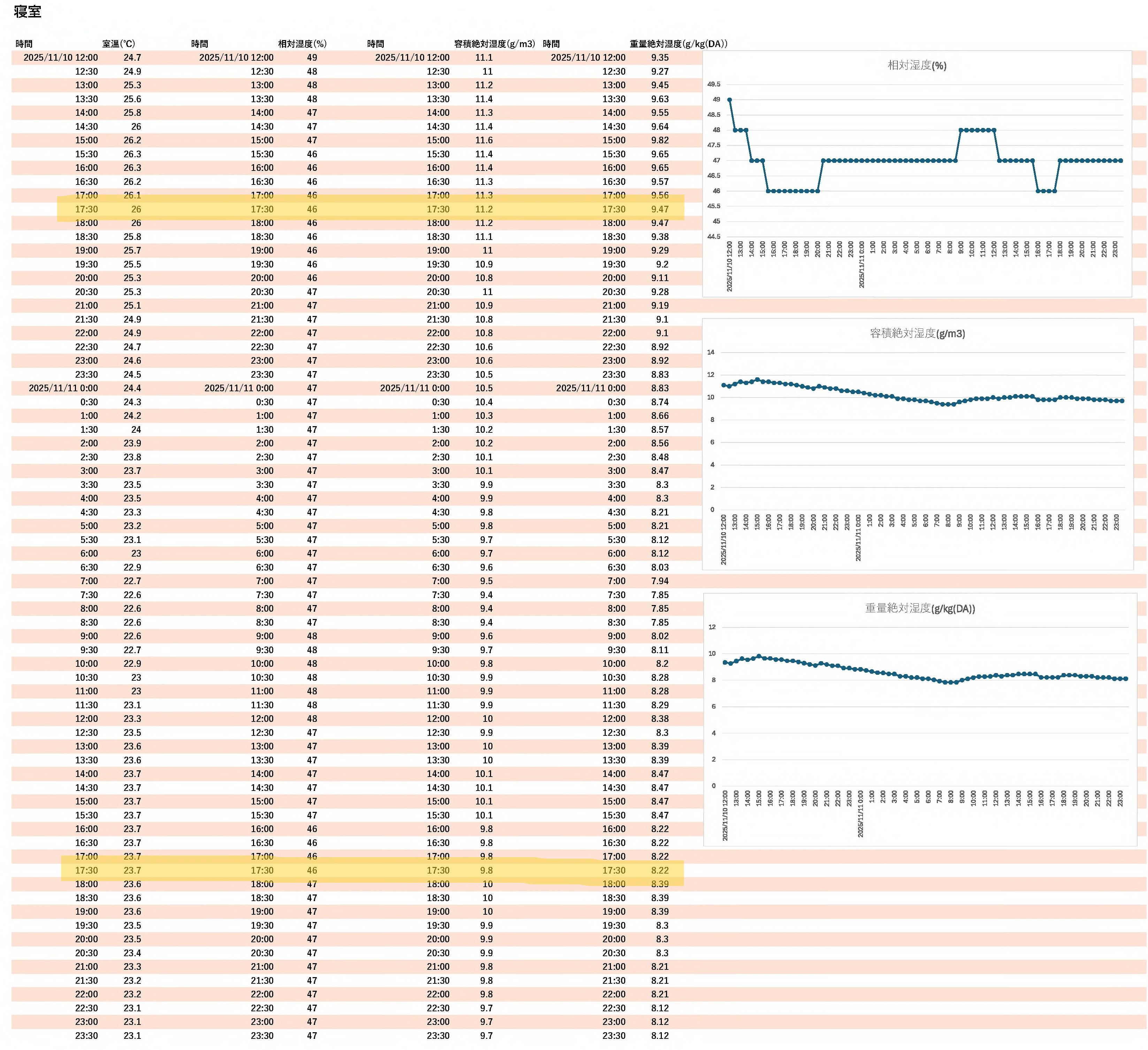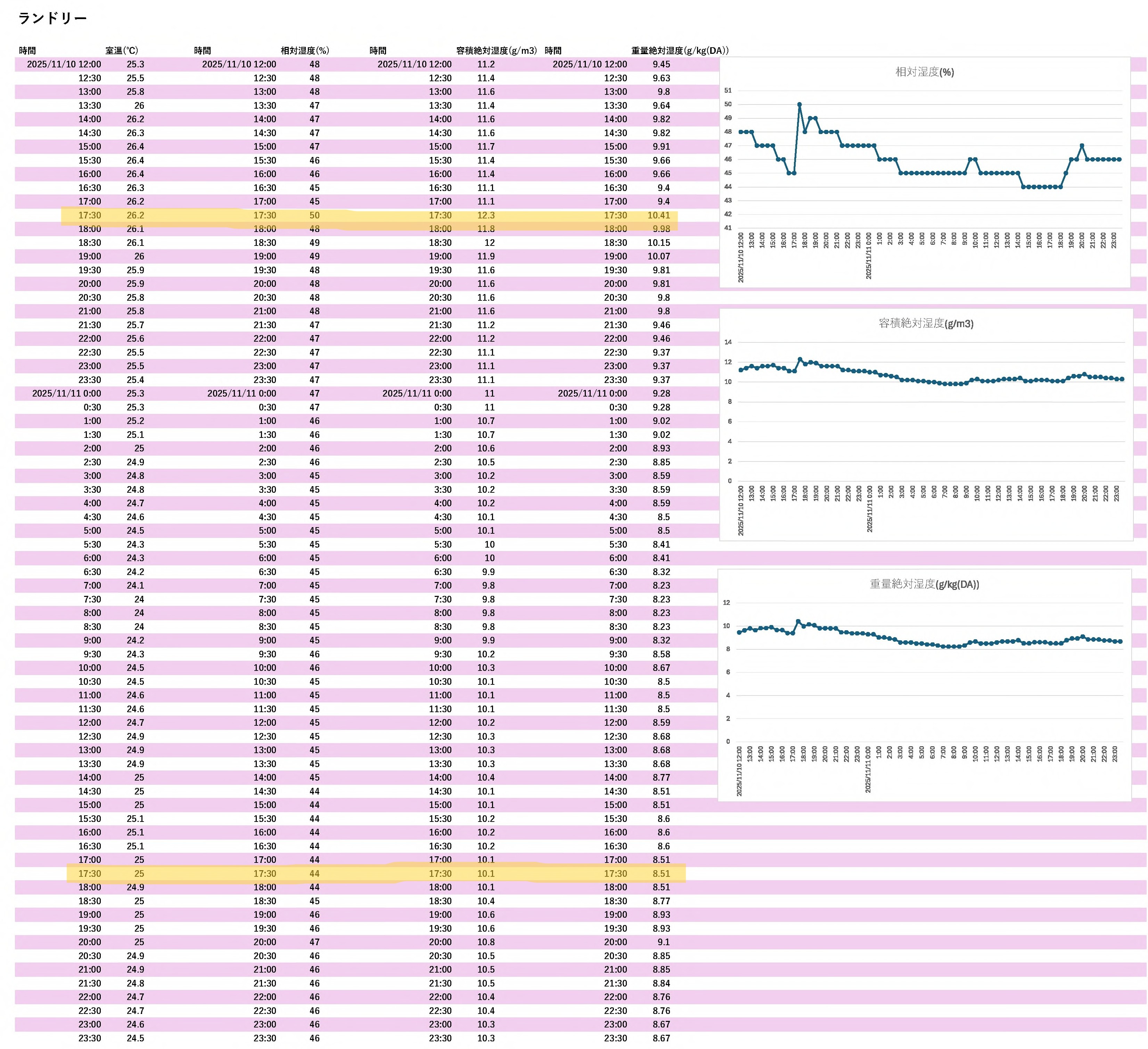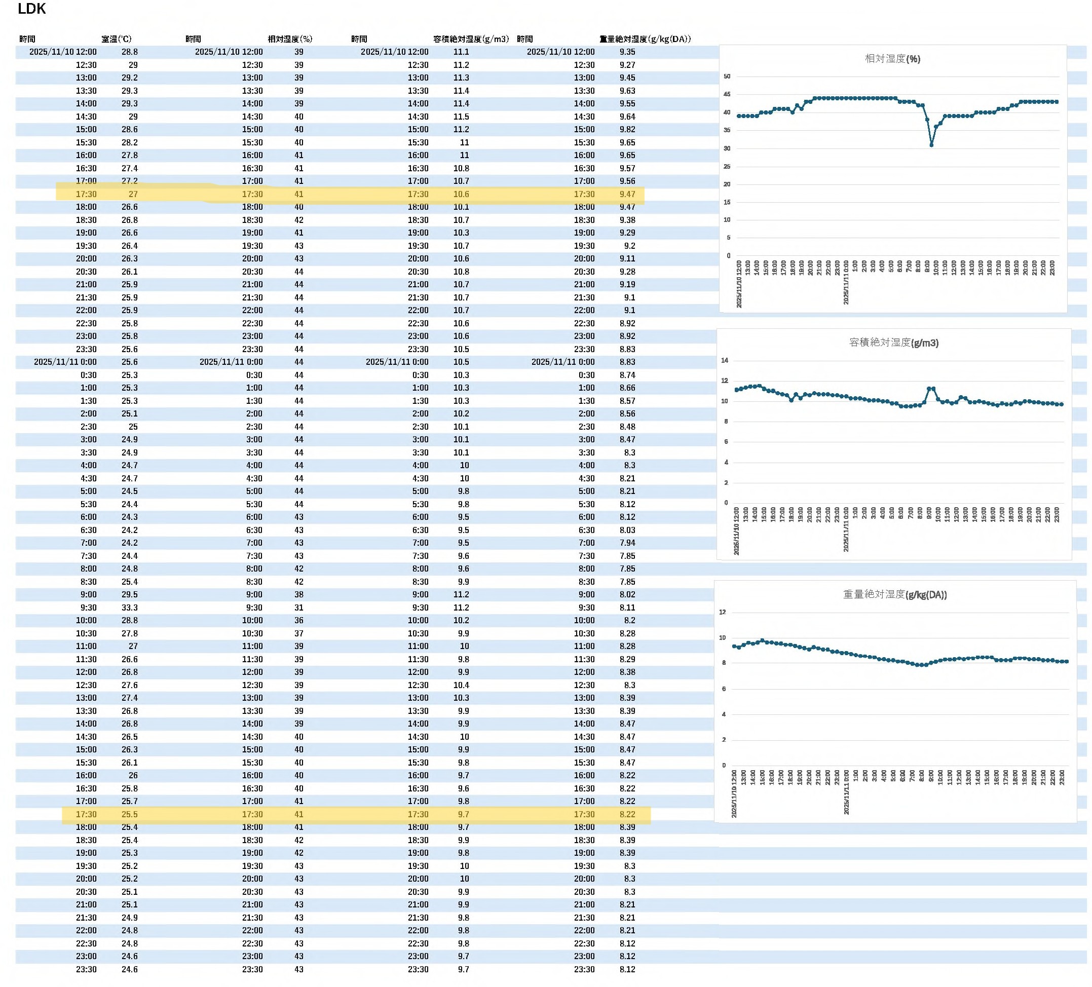 10日17:30 以降、「容量絶対湿度※1 、重量絶対湿度※2」共に上昇がはっきり見て取ることができません。ただ、ランドリー室はかろうじて開始から効果が表れたように見えますが、肝心な各居室は反応が無いと言って等しい結果となっています。