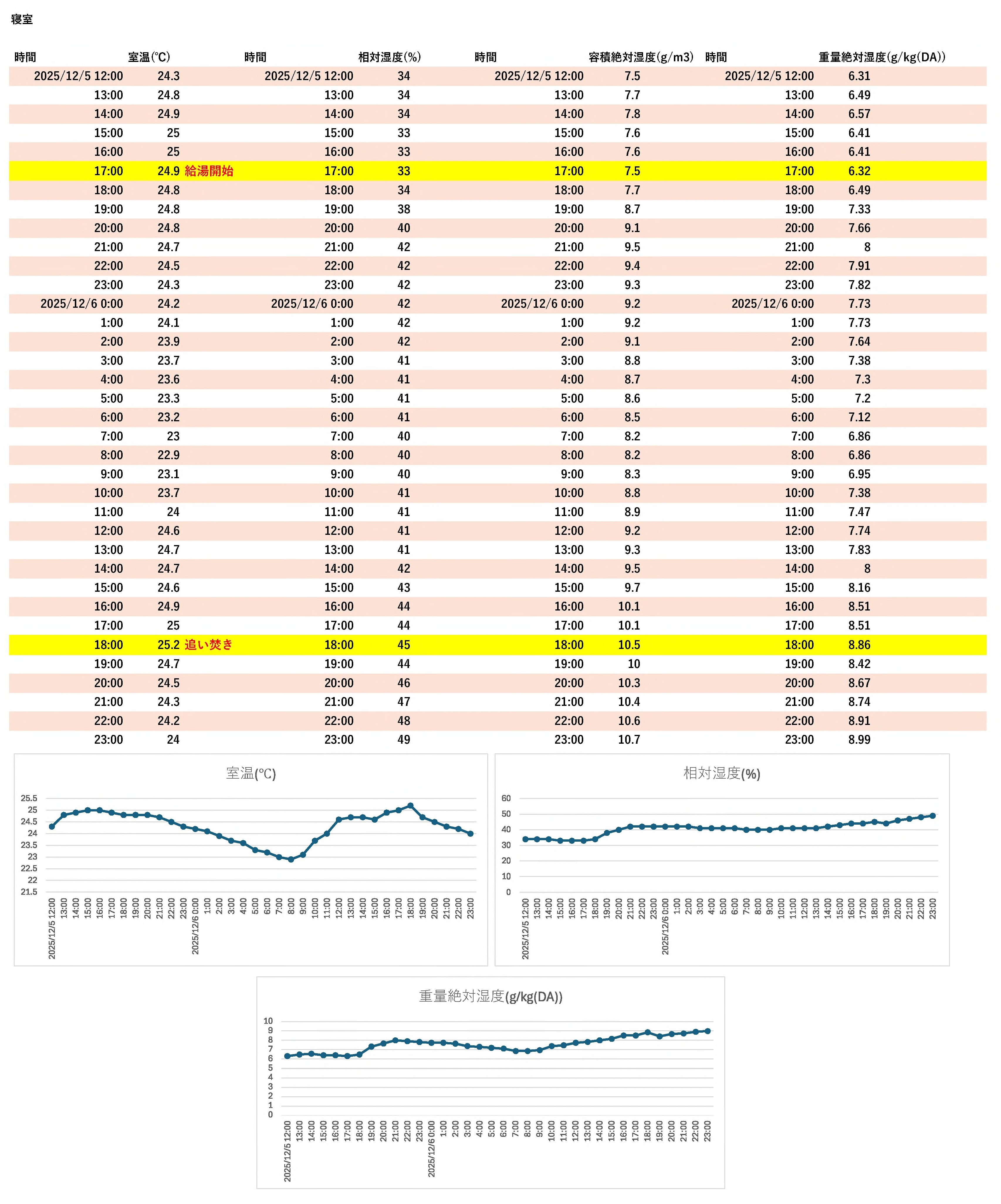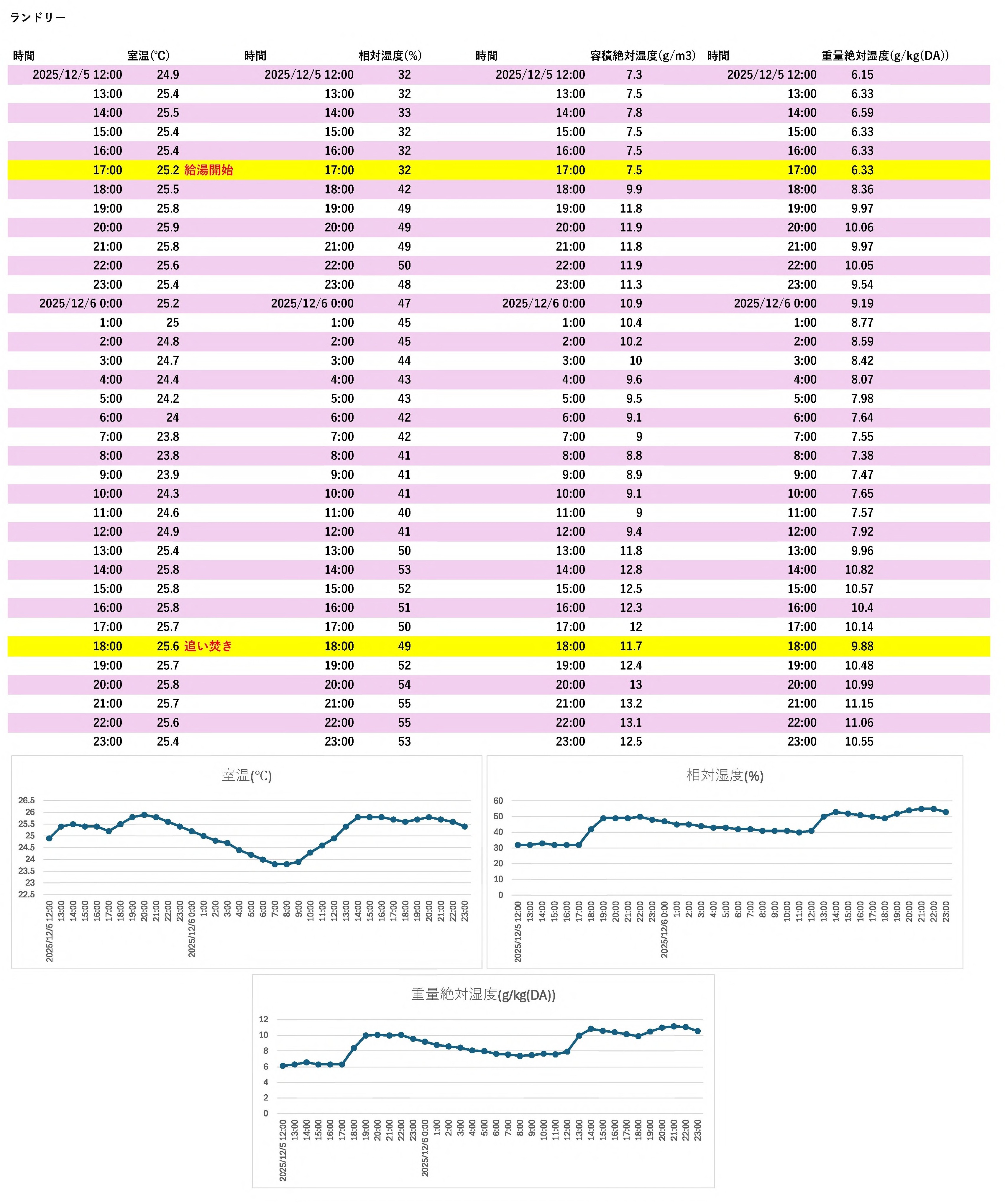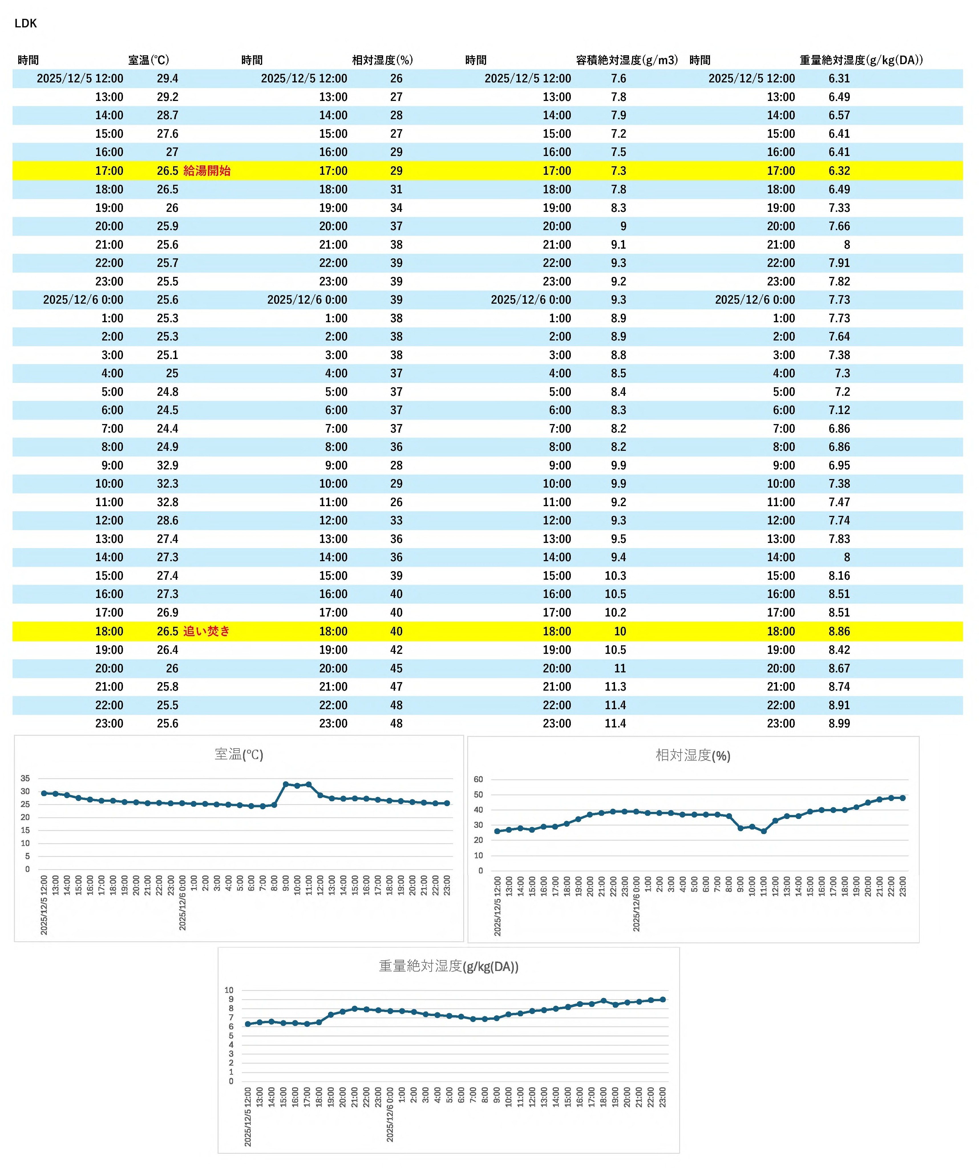 しかし、6日18時からの追い焚き以降、内装材の吸湿が落ち着き、余剰の水蒸気が空気中に留まり始め、