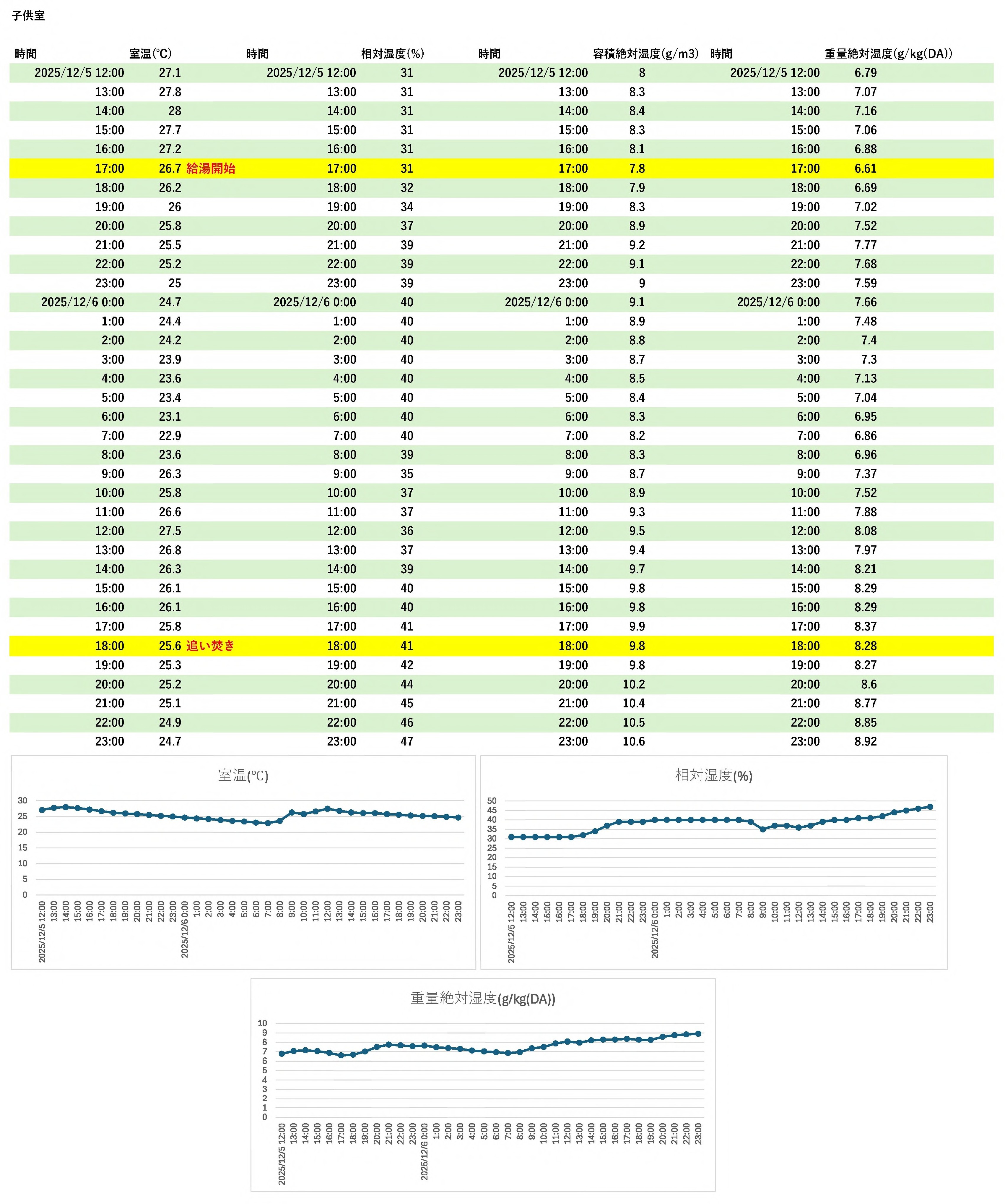 住戸全体の平均重量絶対湿度は、約8g/kg(DA)となり安定傾向に感じます。湯温、湯量、扇風機それぞれ上手く働いた結果と思います。