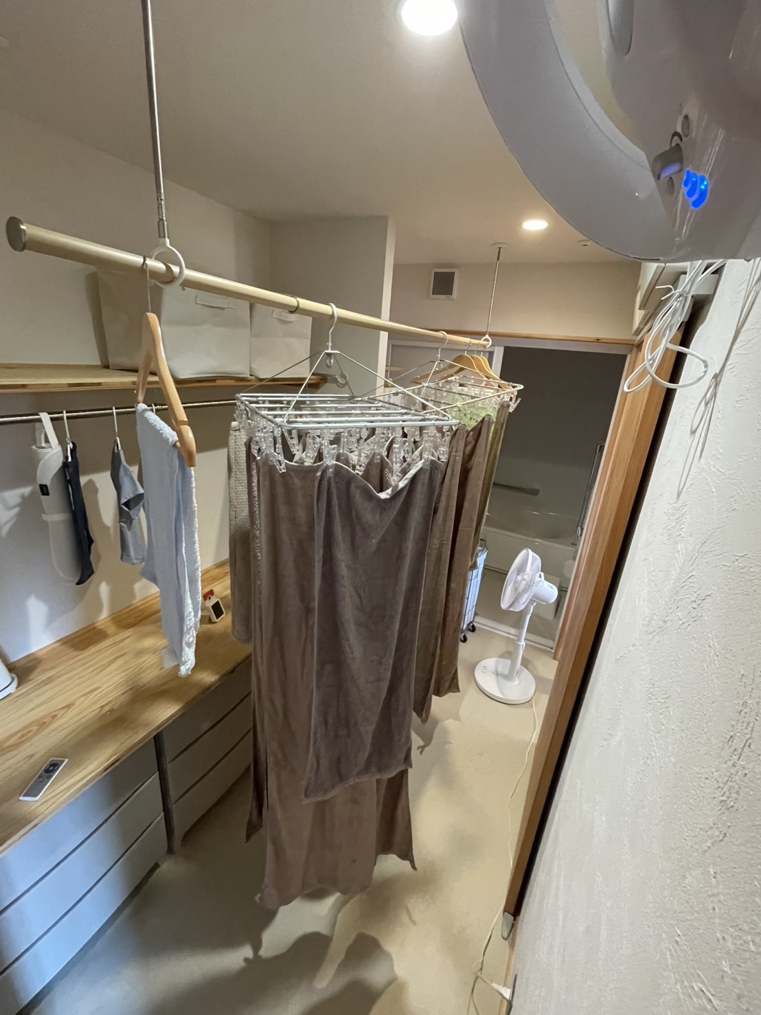 結果、コツをつかめば加湿として利用できることが分かり、一先ず目標を達成することがでましたので、以前からやりたかった冬の室内物干し検証に移っていきます。