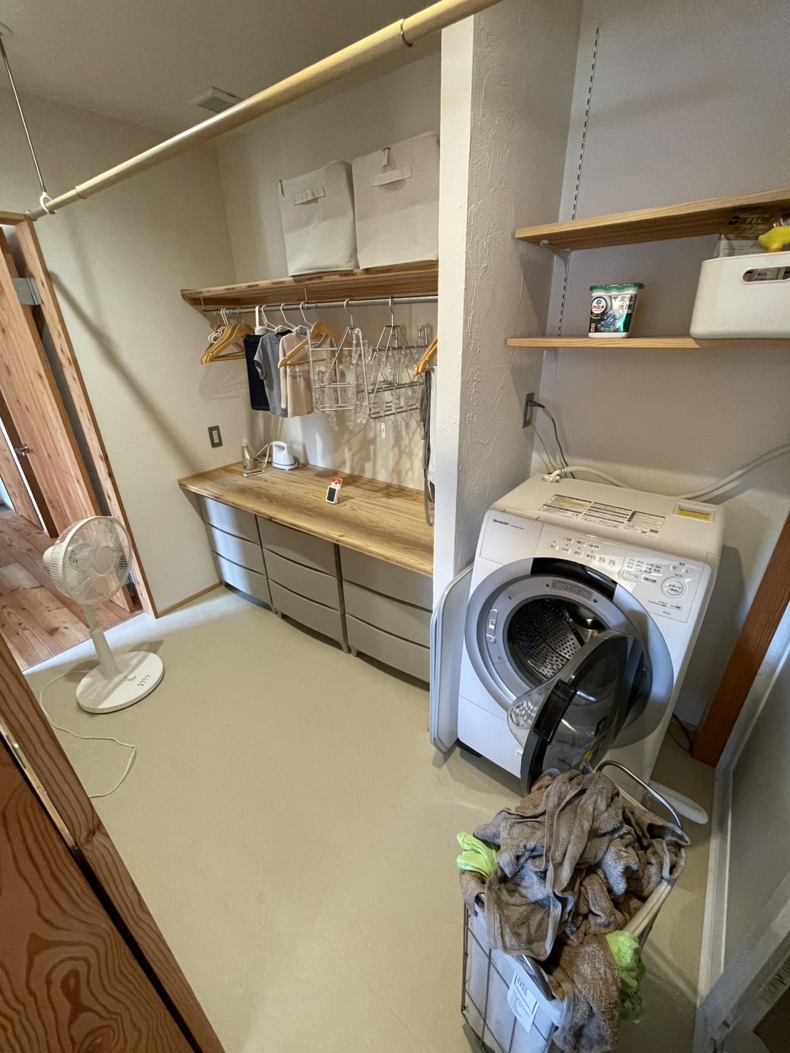 高性能住宅の場合は、洗濯乾燥で乾かすもの。それ以外のものは物干しで。