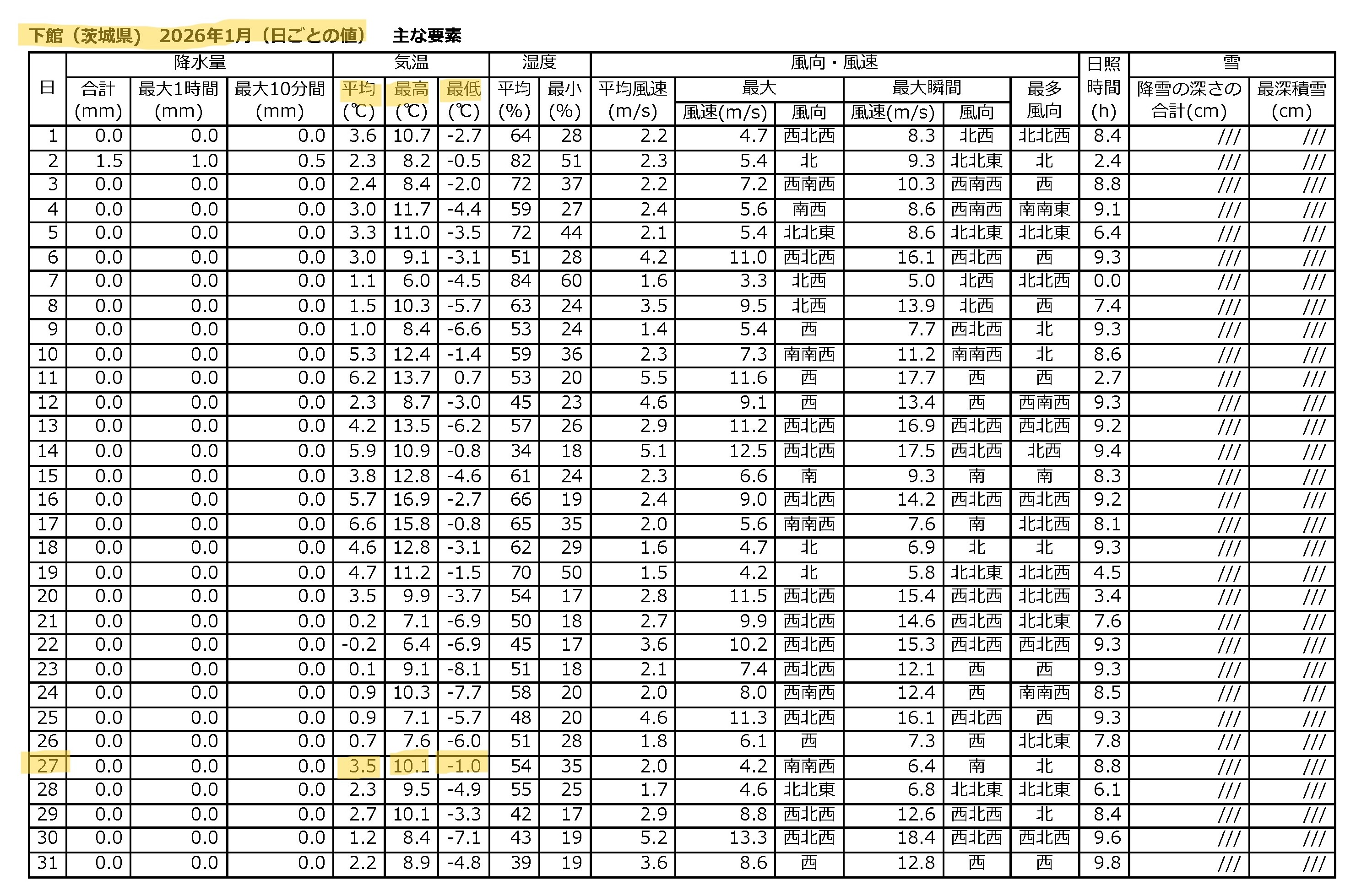 気象庁下館観測所のデータ