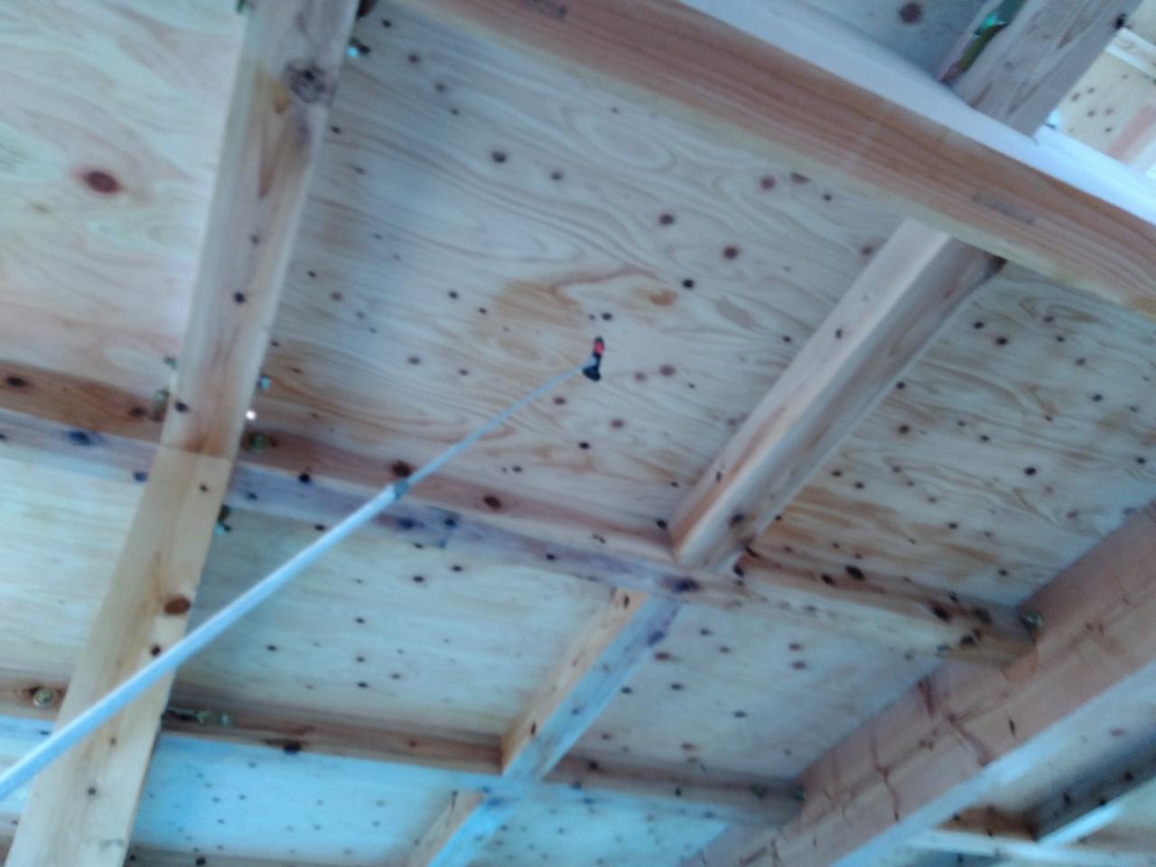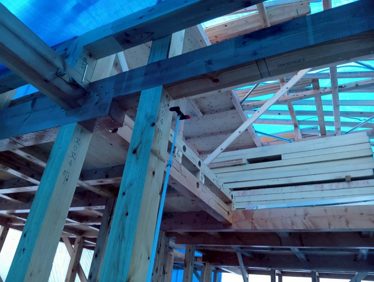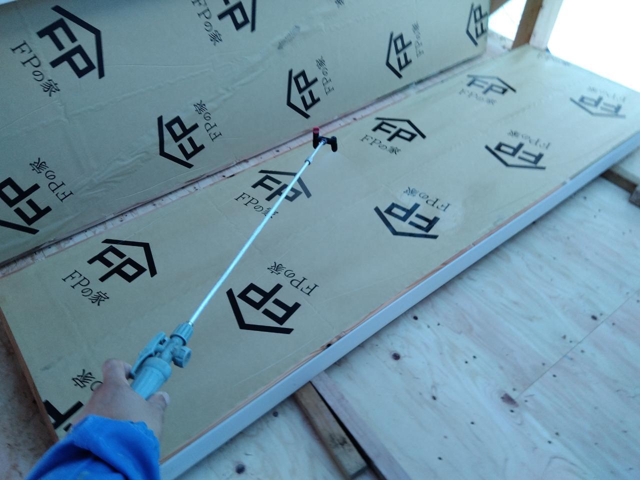 上棟の翌日は、1階柱・小屋・FP壁パネルと2階床の「ホウ酸処理」を行いました。